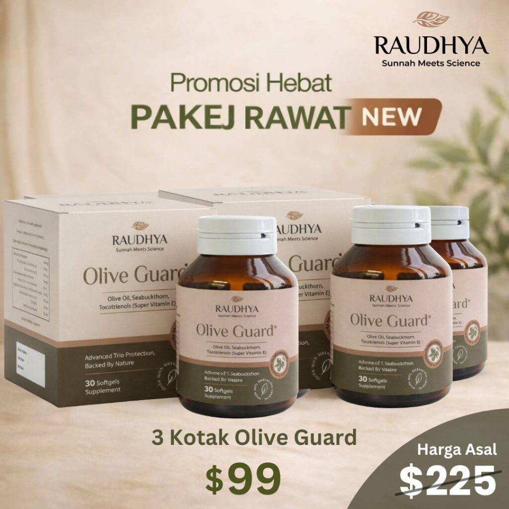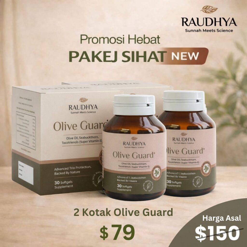 Raudhya OliveGuard+ Diperkaya Bahan Aktif Polyphenols, Tocotrienols (Super Vitamin E) & Omega Aktif Menyokong Kawalan Gula, Kolesterol & Tekanan Darah