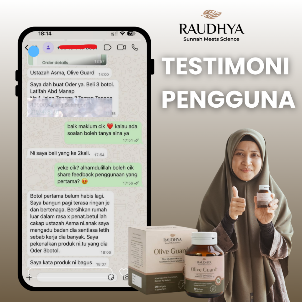 “Sebagai seorang pendakwah dan ibu, saya sangat menitikberatkan apa yang masuk ke dalam badan. Kesihatan satu amanah yang perlu dijaga. Saya pilih Raudhya® kerana ia berasaskan bahan sunnah yang diketahui kebaikannya serta disokong kajian klinikal. Mudah diamalkan, tanpa rasa hanyir, dan sesuai untuk seisi keluarga. Ini antara ikhtiar saya dalam menjaga kesihatan secara semula jadi.”